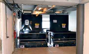 Nybygg: Romslig avfallsrom med direkte tømming i komprimatorer som står på utsiden. Komprimatorene benyttes til kildesortering. Her vist tømming av papp fra tralle og Binge Container med restavfall.
