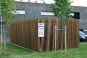 Et avfallsrom kan være så mangt. Her er komprimator for restavfall plassert utendørs med fasadetilpasning.