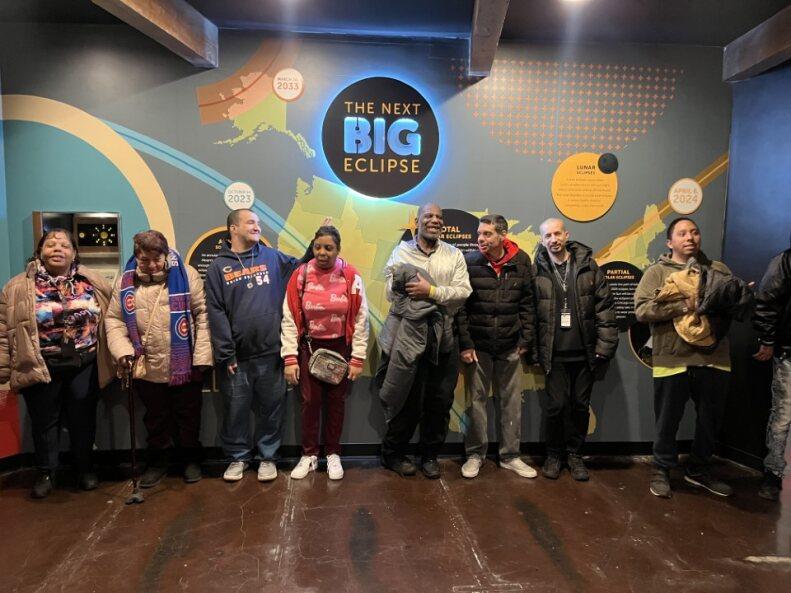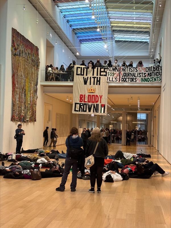 I was at the Art Institute of Chicago and there was a protest. We didn't know the protest was going to happen. It made me sad because it reminded me of my mom ' s death. I didn't like it. I saw a sign that said Cut Ties with Bloody Crown! They are protesting because of the war in Palestine and Israel. No one got hurt during the protest - it was peaceful and we didn't know it was going on and it made some people sad. I got my staff to help me and we went outside because