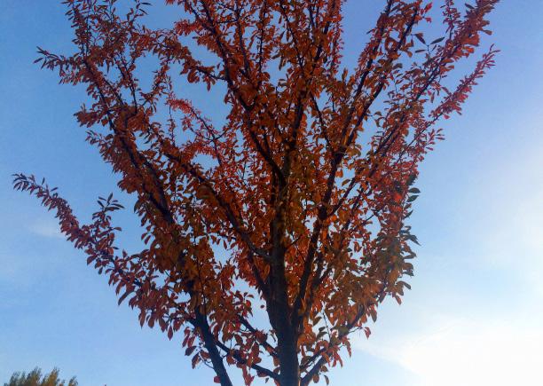 The half-stripped trees struck by a wind together, bending all, the leaves flutter drily and refuse to let go or driven like hail stream bitterly out to one side and fall where the salvias, hard carmine-like no leaf that ever was-edge the bare garden.