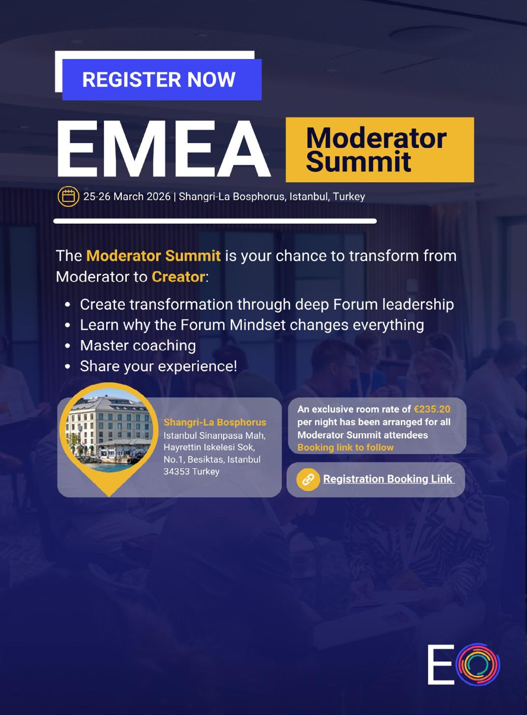 The EMEA Moderator Summit is coming to Istanbul, and spots are filling fast! If you’re a Moderator or Moderator-Elect in MEPA, this is EO’s flagship learning and networking experience for you. Why attend?