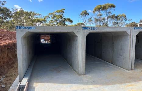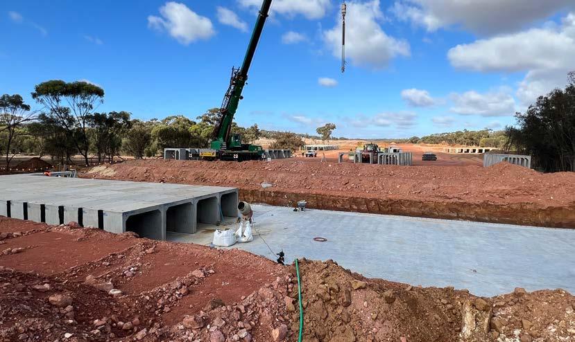 contractor, Garli, partnered with National Precast Master Precaster MJB Industries for the supply of box culverts and pipe for the project. A total of 240 box culverts, measuring 2100 wide x 1800 high, were manufactured for the causeways. As well, 102 pipes with a diameter of 1800mm were provided, configured for installation in a layout spanning 41m in length and six pipes wide.
