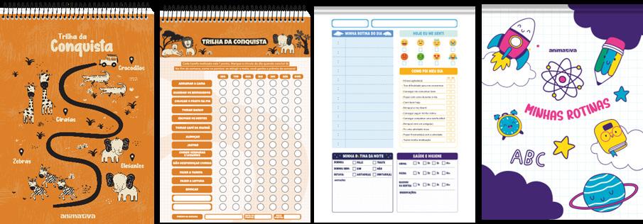 A coleção Animamente inclui a Caderneta de Rotina, com opções de checklist diário, semanal e mensal, incentiva o senso de responsabilidade e planejamento; o Caderno de Planejamento da Rotina, que contempla campos para o acompanhamento da saúde, higiene e de sentimentos; e o Caderno Trilha da Conquista, que aplica uma metodologia de pontuação e recompensas para fortalecer o engajamento e a autoconfiança dos pequenos.