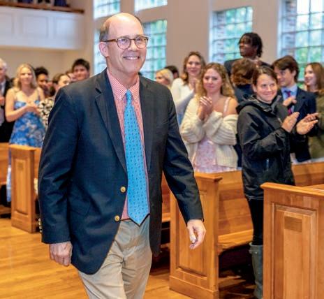 Boota deButts walks to accept the dedication of the 2024 Whispers during the ninth annual Fortiter, Fideliter, Feliciter service. “We take heart in knowing that he has invested too much of himself in this place for him to truly leave it, or us, behind,” the Whispers editors wrote. The School would like to thank deButts for his brave, faithful, and joyful service as the Chief Financial Officer since 2005.