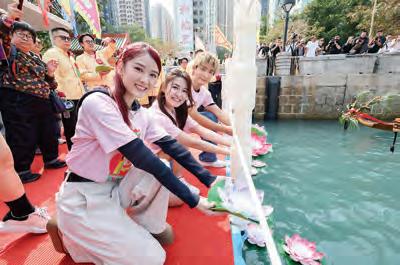 同場亦設有放水燈儀式,參加者透過將水燈 放入海中,寓意傳達心願及祈福消災。今年相關 活動首次開放予公眾參與體驗,吸引不少市民報 名。 3 位南區之友歌手及演員張馳豪、潘靜文以 及藝員江嘉敏亦有到場參與祈福放水燈,祈求工 作順風順水。