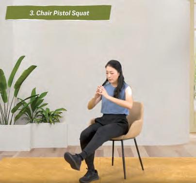 3 、座椅單腳起立(Chair Pistol Squat) 這個動作模擬日常生活中的坐下與站起,能 有效鍛鍊大腿與臀部肌力。