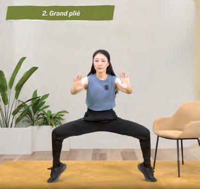 Step1:雙腳外開呈自然八字站立,腳間距約 為肩寬 1.5 至 2 倍。背部挺直,核心收緊。可手 扶牆壁或椅背。