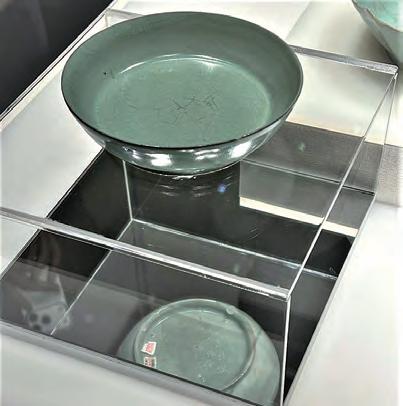汝窯碟以壓克力架子架高,底部放面鏡子,這樣就可 以看到支釘缺口。