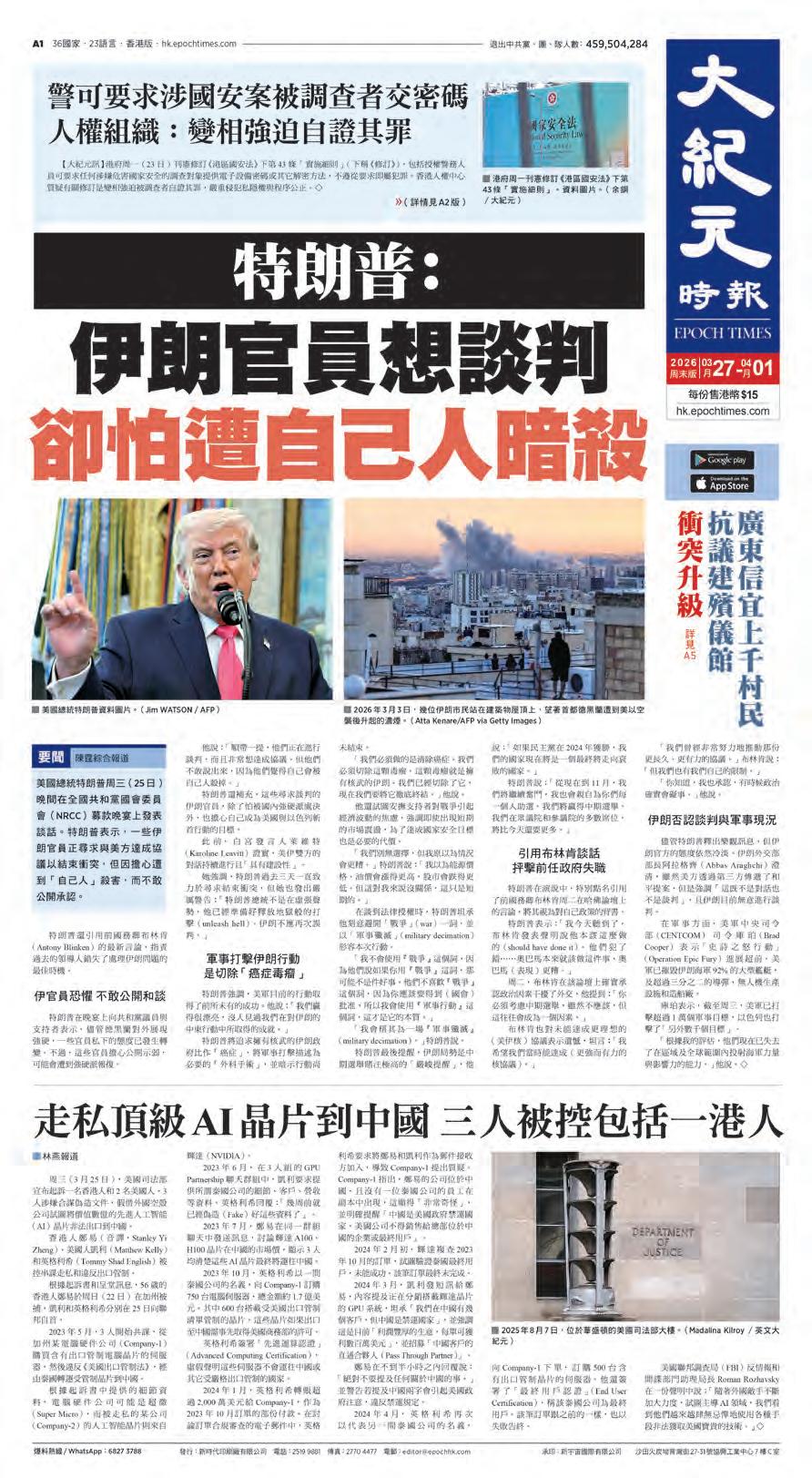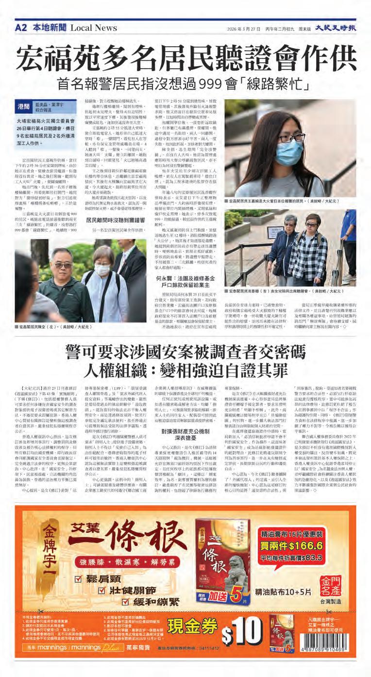 在這樣的黑暗年代,香港《大紀元》以信念 為筆、以勇氣為盾,成為新聞界最堅定的一道防 線。它們沒有退縮,沒有向權勢低頭,反而在壓 力與威嚇之中,更堅定地履行記者的使命——追 求真相,揭露不義,守護香港仍存的一點光