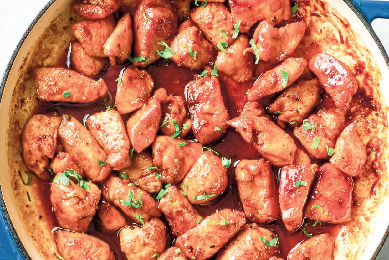 3 ∼ 4 分鐘,至牛油融化、醬汁濃縮至一半 且呈現光澤,均勻裹覆在雞肉表面,離火。 如果喜歡,可以撒上切碎的新鮮歐芹和紅辣 椒片作為裝飾。