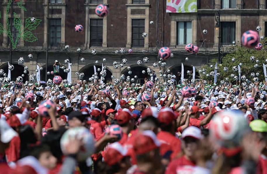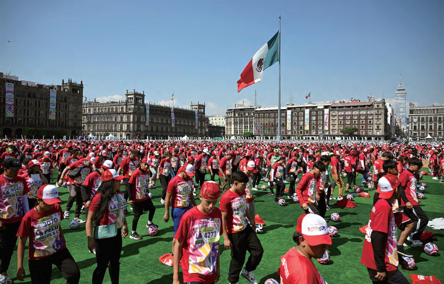 該活動於 3 月 15 日在墨西哥 城地標憲法廣場(Zócalo,俗稱索 卡洛廣場)舉行,約 9, 500 名來自 不同年齡段的參與者手持足球、整 齊排開,在專業教練的帶領下進行 踢球、傳球、控球等各種足球基礎 訓練,全程約 40 分鐘。整個廣場 宛如一座巨大的露天足球訓練場, 場面十分壯觀。
