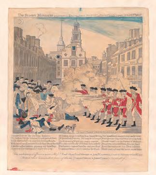 保羅里維爾(Paul Revere)刻 印的《波士頓大屠殺》(The Boston Massacre),描繪 1770 年英軍向平民 開火的場面,成為激發殖民地反英情 緒的重要宣傳圖像。當時約兩千名英 軍士兵駐紮城中,以強制徵收進口商 品稅,社會緊張情勢日益升高。版畫 描繪約 20 名手無寸鐵的波士頓居民, 在英軍托馬斯 普雷斯頓上尉指揮下遭 近距離射擊。然而當時的紀錄顯示, 現場情況實際上更為混亂:約 50 多 名美國民眾手持棍棒與冰塊投擲物, 嘲弄並威脅少數士兵。里維爾將事件 呈現為蓄意攻擊的場面,透過標題 用語與將海關大樓標示為「屠宰廳」 (Butcher’s Hall),強烈傳達憤慨情 緒。