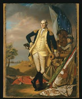 這幅作品源自其兄查理斯威爾森 皮爾(Charles Willson Peale)著名華 盛頓全身戎裝像的構圖,但透過重新 設計的背景場景,將華盛頓與具體歷 史時刻緊密連結,使他不僅是英雄人 物,更成為革命勝利與國家誕生的視 覺象徵。畫中的華盛頓神情沉著而克 制,傳達出紀律、責任與自律的品 格,這些特質後來在他建立文人領導 軍隊的傳統,以及 1797 年自願卸任總 統、拒絕權力終身化的決定中得到體 現。此舉不僅避免新國家滑向個人統 治,更確立民主政體權力和平移轉的 典範,使華盛頓從戰爭英雄昇華為共 和制度與公民美德的象徵。