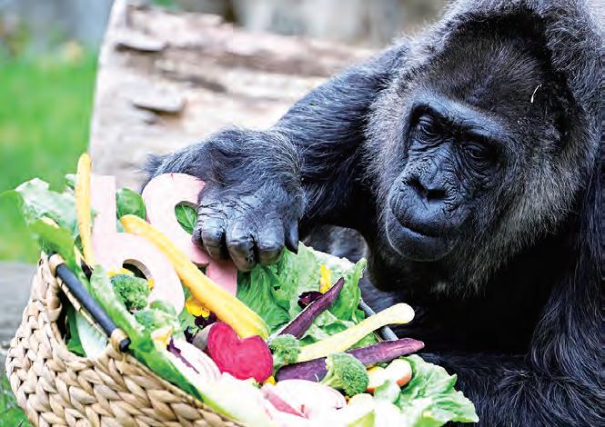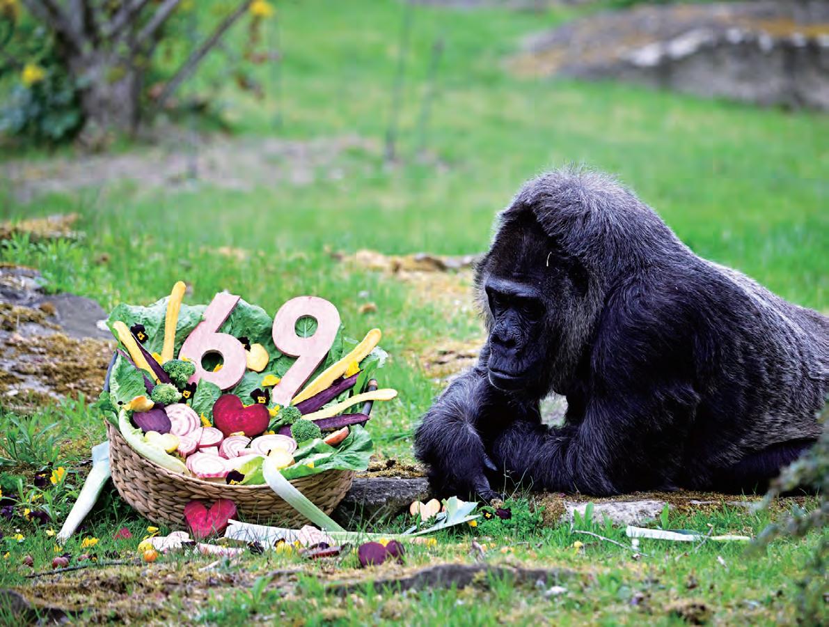 4 月 13 日,德國柏林動物園內最 年長的大猩猩「法圖」(Fatou) 迎來了 69 歲生日,園方精心 準備了一籃子牠最愛的新鮮蔬 果,為這位「高齡壽星」慶生。