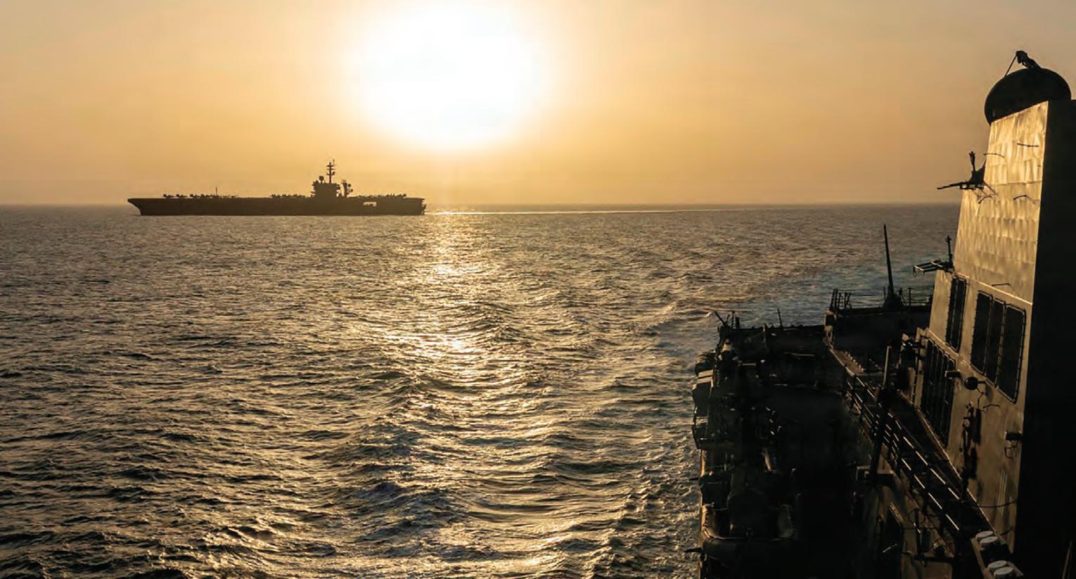 This US Navy handout photograph released on April 17, 2026, by US Central Command Public Affairs shows USS Abraham Lincoln (L) conducting blockade operations in the Arabian Sea on April 16, 2026.