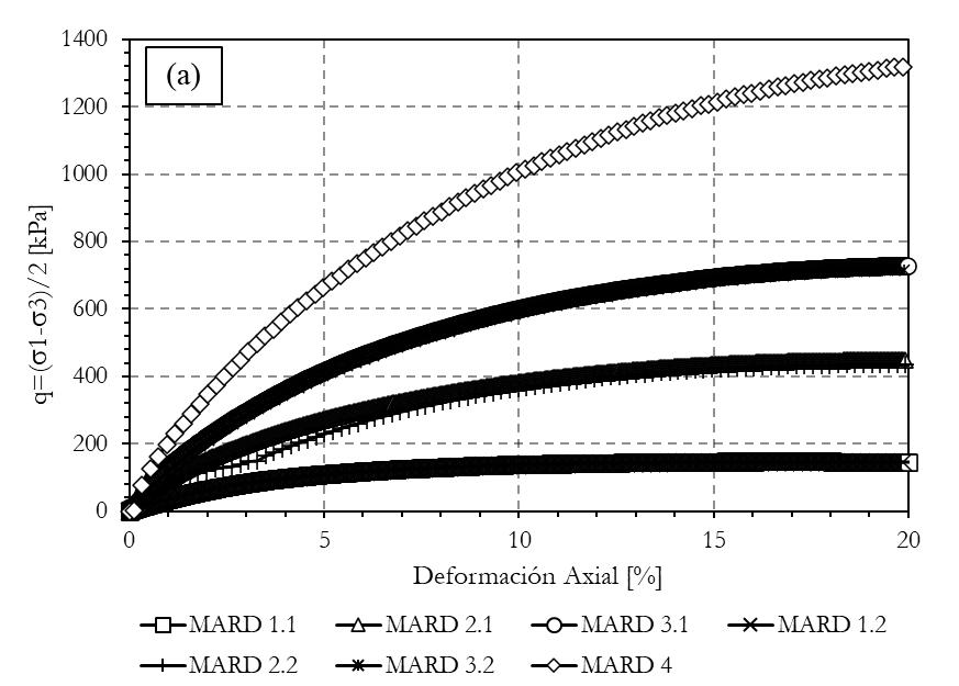 Figura5:ResultadosdeensayostriaxialesCIDparalaArenade RelavesElTorito(izquierda)ylaEscoriadeHierro(derecha).