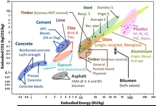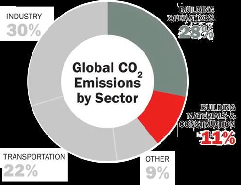 • 39 % de las emisiones de CO2 : carbono operacional (operationalcarbon,28%): calefacción, refrigeración, iluminación, etc. carbono incorporado (embodiedcarbon, 11%): fabricación de materiales, procesos constructivos, etc.