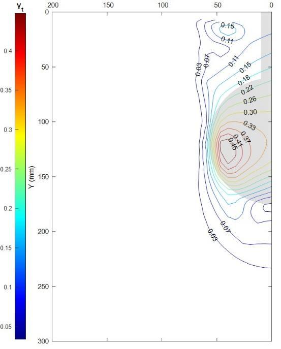 Las Figuras 1(c), 3 (a )(b) muestran la distribución de los empujes sísmicos a lo largo del tiempo de análisis para las tipologías estudiadas. Se observa que en las edificaciones de 5P y 15P los empujes con estructura (C/estr.) alcanzan valores máximos significativamente superiores en comparación con el caso sin estructura (S/estr.), registrándose incrementos de aproximadamente 40 % en 5P y 44 % en 15P. En el caso de la edificación de 30 pisos (30P), si bien los empujes máximos con estructura siguen siendo mayores, la diferencia relativa se reduce, con un incremento aproximado de 4 % respecto al escenario sin estructura.