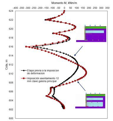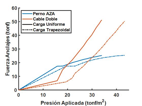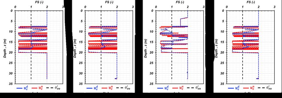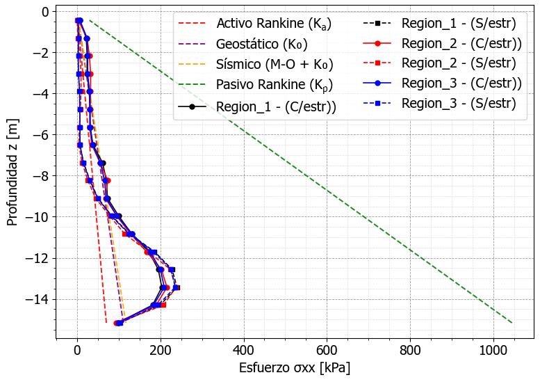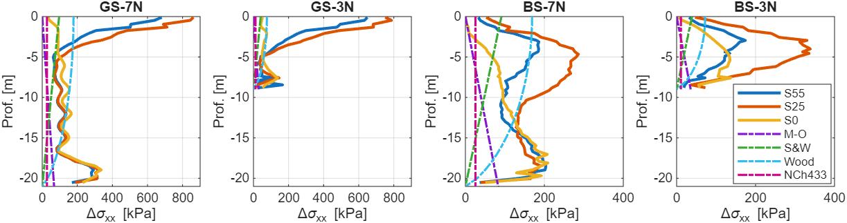 Las Figuras 1(d) y 3(c)(d) presentan la distribución de los esfuerzos laterales con la profundidad para los casos analizados. Se observa que en las edificaciones de 5P y 15P los esfuerzos obtenidos con estructura (C/estr.) son consistentemente mayores que en el escenario sin estructura (S/estr.), mostrando una diferencia marcada en los niveles intermedios de los muros. En cambio, en la edificación de 30P, si bien los esfuerzos siguen siendo superiores con estructura, la diferencia relativa con respecto al caso sin estructura se atenúa, evidenciando que el comportamiento global está más controlado por la respuesta del suelo.