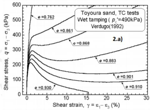 Figura1:(a)Comportamientoscontractivoydilatantesegúnladensidaddel sueloestudiado(Ochoa,2025).(b)Evolucióndelatrayectoriadetensionesydel gráficotensión–deformaciónsegúnlaevolucióndeladensidadrelativaoel índicedevacíos(Verdugo,1992).