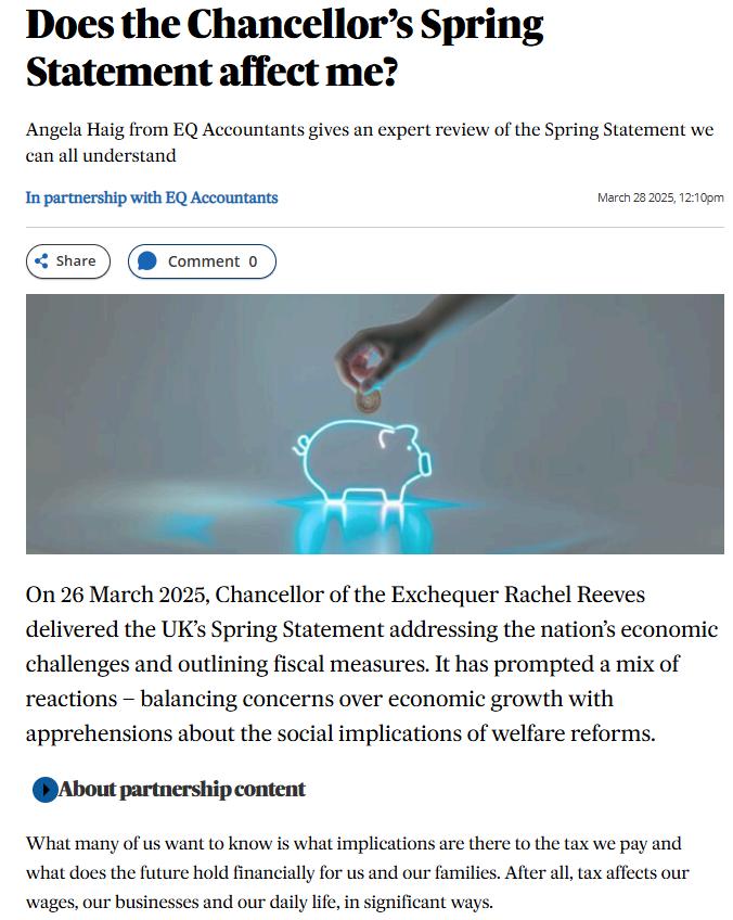 EQ Partner Angela Haig was featured in The Courier, sharing her insights on the UK Spring Statement. She highlighted the government’s decision to avoid tax rises and raised concerns about how increased spending will be funded, particularly through welfare reforms. This is a great example of EQ’s expertise being recognised in the media!