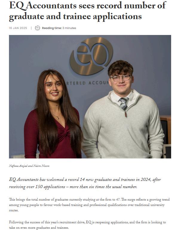 EQ featured in the Scottish Financial Times and The Courier with articles on our graduate and trainee applications. Between the two publications, we achieved 79,500 impressions! That is potentially 79,500 new clients who have been exposed to the EQ brand!