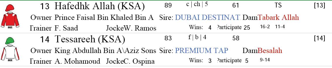 Start Time 07:30 Arabian Horses Maiden Prize First Second Third Fourth Fifth Track Record ةئدتبملا ةيبرعلا ليخلا قلاطنلاا تقو ةزئاجلا ةميق لولأا يناثلا ثلاثلا عبارلا سماخلا يسايقلا نمزلا RACE RESULT 1 ST 2 ST 3 ST 4 ST ةجيتنلا نمزلا لولأا يناثلا ثلاثلا عبارلا Horse Name: Fakir Du Pou 2:27.08 يوب ود ركاف : داوجلا مسا +4 Year Old تاونس 4+ SR2500 SR5000 SR10000 SR7500 SR25000 SR50000