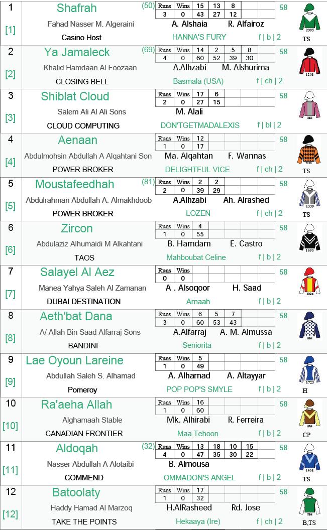 Start Time 05:30 Local bred Fillies Maiden Prize First Second Third Fourth Fifth Track Record يلحم جاتنا ةئدتبملا سارفلاا قلاطنلاا تقو ةزئاجلا ةميق لولأا يناثلا ثلاثلا عبارلا سماخلا يسايقلا نمزلا RACE RESULT 1 ST 2 ST 3 ST 4 ST RACE TIME: ةجيتنلا نمزلا لولأا يناثلا ثلاثلا عبارلا 3 Year Old تاونس 3 Horse Name: Abreek 1:47.45 كربا : داوجلا مسا SR2500 SR5000 SR10000 SR7500 SR25000 SR50000