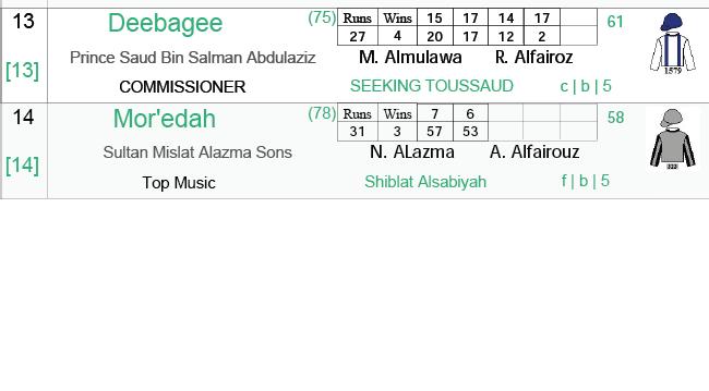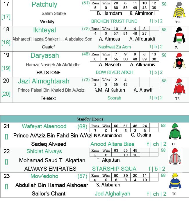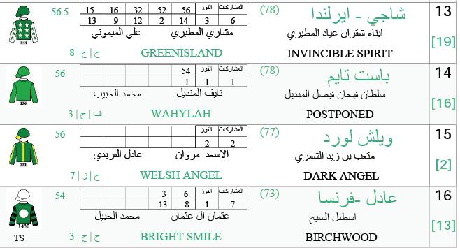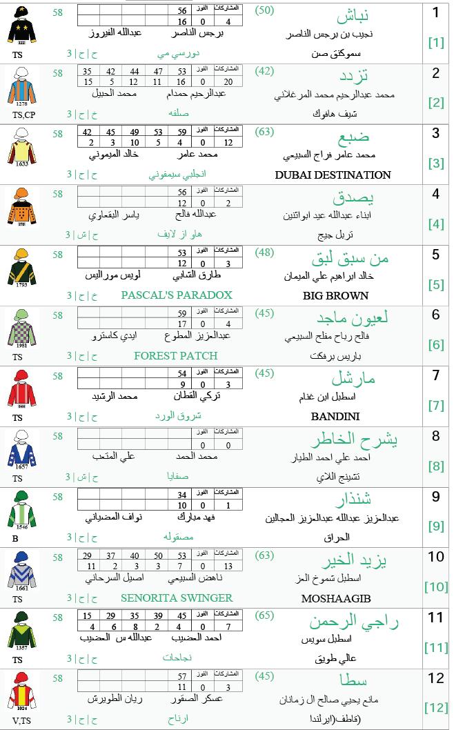 Start Time Prize First Second Third Fourth Fifth Track Record قلاطنلاا تقو ةزئاجلا ةميق لولأا يناثلا ثلاثلا عبارلا سماخلا يسايقلا نمزلا RACE RESULT 1 ST 2 ST 3 ST 4 ST DISTANCE RACE TIME: ةجيتنلا نمزلا لولأا يناثلا ثلاثلا عبارلا ةفاسملا Fillies Maiden (Hands&Heels) )طوسلا مادختسا نودب( ةئدتبملا سارفلاا 03:00 3 Year Old تاونس 3 SR2500 SR5000 SR10000 SR7500 SR25000 SR50000 Horse Name: Alnajem Almuneer 1:22.07 رينملا مجنلا : داوجلا مسا