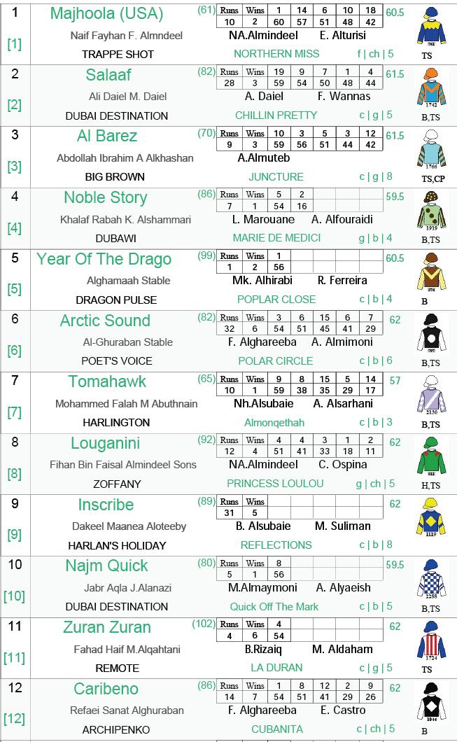 Welcome back to King Abdulaziz Racetrack for this season’s 63rd meeting. There are eleven races on the card today, including the prestigious Latin America Cup and a JCSA Award race. Our first race is a hands and heels fillies’ maiden over 1400m. As all runners are winless three-year-olds, the prize is all to play for, however daughter of Oasis Dream, Kadinnka, is worth some attention having run once over this distance already. Race two is a handicap over 1400m worth 145,000SR. Othman Ab dullah Alothman’s Aadel may improve on the back of a break since June, though he could struggle to overcome a wide draw. Five-time winner Insurgence will present him with some stiff competition.The third race is for locally-bred horses over 1400m again. Nicely drawn Hifeyn already has five career wins, but must beat Almarke who is expected to perform despite a wider draw and extra weight to carry. The fourth race is another for locally-bred two-year-olds over 1600m. Son of Dubai Destination Raambow is an interesting debutant. Race five is the first of two maidens for locally-bred two-year-old fillies, over 1600m. Daughter of Power Broker, Moustafeedhah, looks to be the one to beat having been the runner up over this trip previously and is now due a win for trainer Abdulaziz Alhzabi. Race six is the second of our locally-bred fillies’ races, this time over 1800m. The pick of the parade this time looks to be Tatool Alghaym, who steps up in trip after an impressive second last time out, this time with both tongue strap and sheepskin cheekpieces back on. If she can stay the course, she could take all the beating.