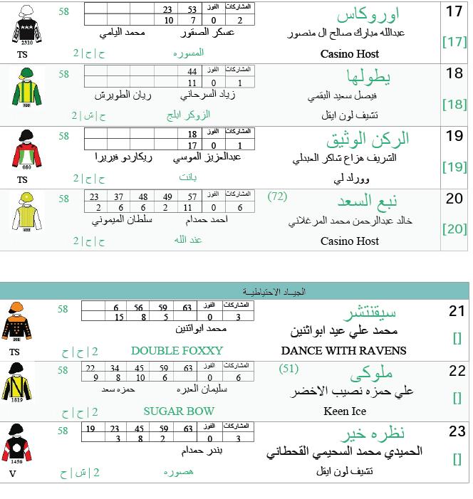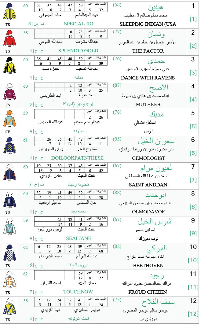 Start Time 06:30 JCSA Award Prize First Second Third Fourth Fifth Track Record ةيريدقتلا ليخلا تاقابس يدان ةزئاج قلاطنلاا تقو ةزئاجلا ةميق لولأا يناثلا ثلاثلا عبارلا سماخلا يسايقلا نمزلا RACE RESULT 1 ST 2 ST 3 ST 4 ST DISTANCE RACE TIME: ةجيتنلا نمزلا لولأا يناثلا ثلاثلا عبارلا ةفاسملا +3 Year Old تاونس 3+ Horse Name: Fly Down 2:27.68 نواد يلاف : داوجلا مسا SR6500 SR13000 SR26000 SR19500 SR65000 SR130000