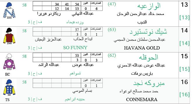 Start Time 07:30 Open Prize First Second Third Fourth Fifth Track Record تاجردلا حوتفم قلاطنلاا تقو ةزئاجلا ةميق لولأا يناثلا ثلاثلا عبارلا سماخلا يسايقلا نمزلا RACE RESULT 1 ST 2 ST 3 ST 4 ST DISTANCE RACE TIME: ةجيتنلا نمزلا لولأا يناثلا ثلاثلا عبارلا ةفاسملا +3 Year Old تاونس 3+ SR4750 SR9500 SR19000 SR14250 SR47500 SR95000 Horse Name: Alhakem 1:59.88 مكاحلا : داوجلا مسا