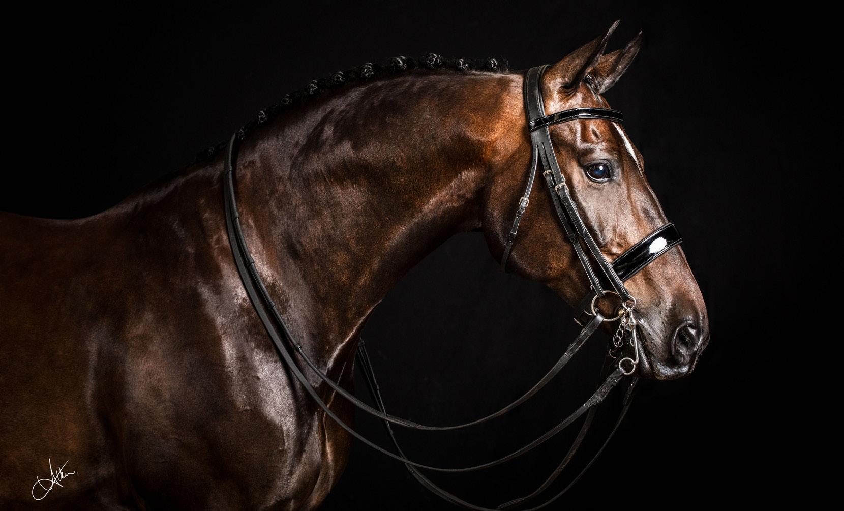 The third component, a high-suspended hair light positioned behind and above the subject, proved indispensable. It illuminated the braided mane and the crest of Danceiro’s neck, creating a crisp rim of light that separated him cleanly from the deep black backdrop.