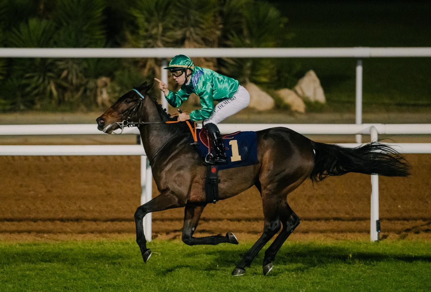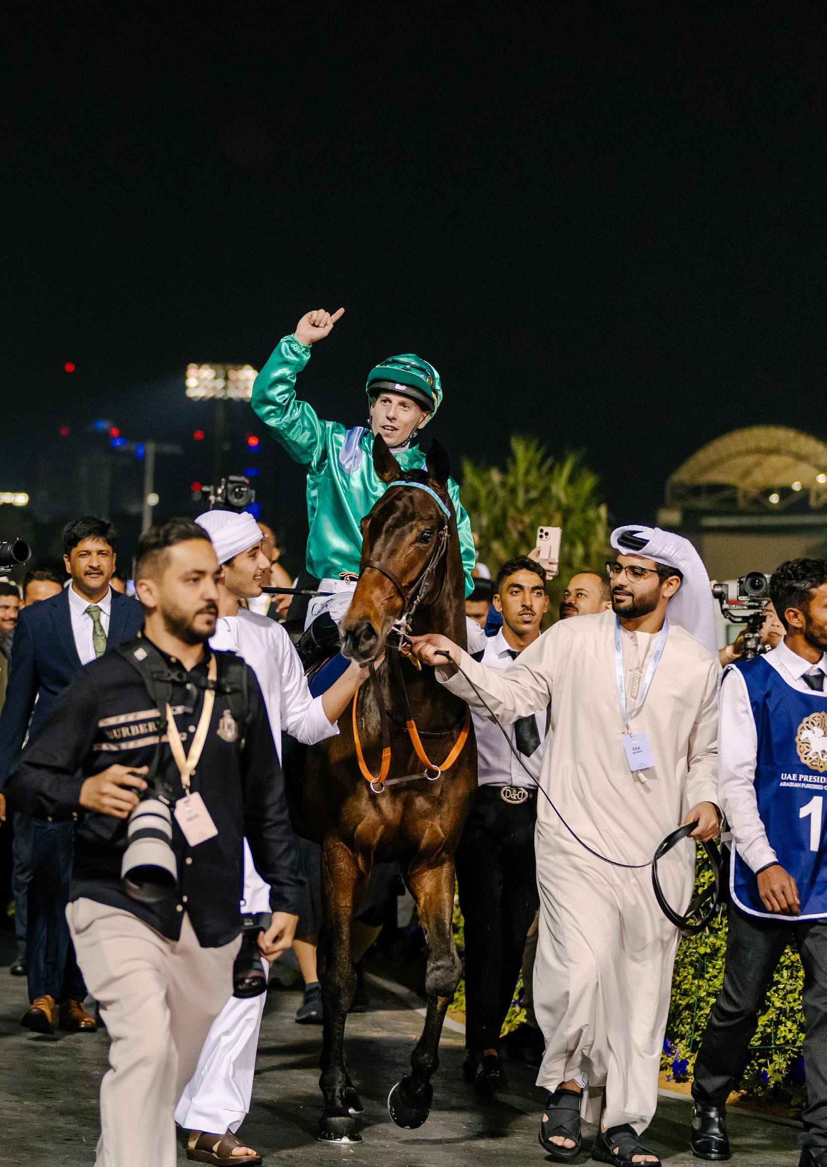 LEFT: HM ALCHAHINE, ridden by Cristian Demuro, claims the title at the UAE President Cup 2025.