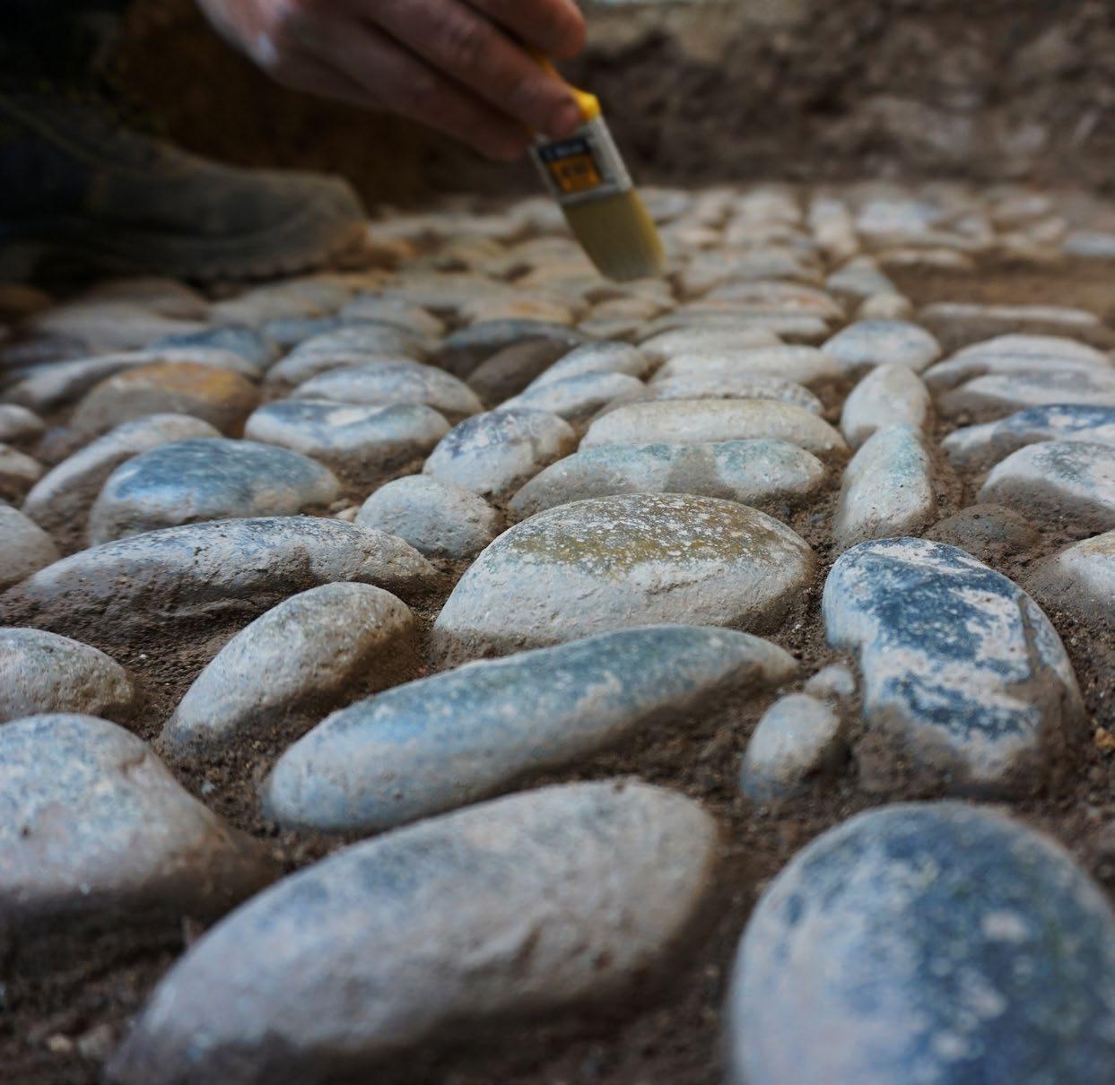 1. Se hallaron elementos importantes de la época fundacional de este espacio público. Debajo de una de las torres se encontró una pintura mural que representa el dibujo de ladrillos distribuidos alternadamente. Además, se recuperó el antiguo piso de cantos rodados que cubría la plazuela, y que data del siglo XVII.