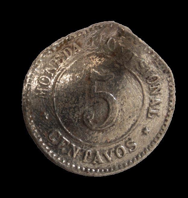 3 Durante nuestros trabajos arqueológicos en el Centro Histórico de Lima, hemos podido hallar una moneda conmemorativa de la heroica resistencia del Huáscar y Miguel Grau durante el combate de Angamos, el 8 de octubre de 1879. Esta moneda recuperada también al interior del canal presenta la siguiente inscripción en el anverso: A MIGUEL GRAU HOMENAJE DEL PUEBLO DEL CALLAO 14 DE NOVIEMBRE DE 1897; en el reverso de la misma dice: El HUASCAR 8 DE OCTUBRE DE 1879. Según la revisión realizada, esta moneda conmemorativa se habría entregado con motivo de la inauguración del monumento a Miguel Grau, realizado el 21 de noviembre de 1879 en la Plaza Grau, Callao.