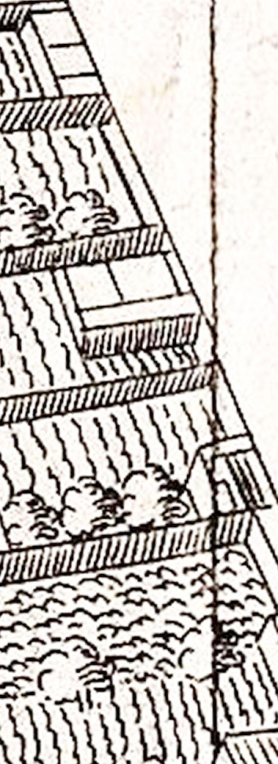Detalle del Plano Escenográfico de Lima de Pedro Nolasco (1687), con representación de un montículo coincidiendo exactamente con la ubicación de la llamada Huaca de Santa Ana. En: “The City of Kings. before its destruction by the great earthquake of 1746” – Harper & Brothers, 1835 (Yale University Library).