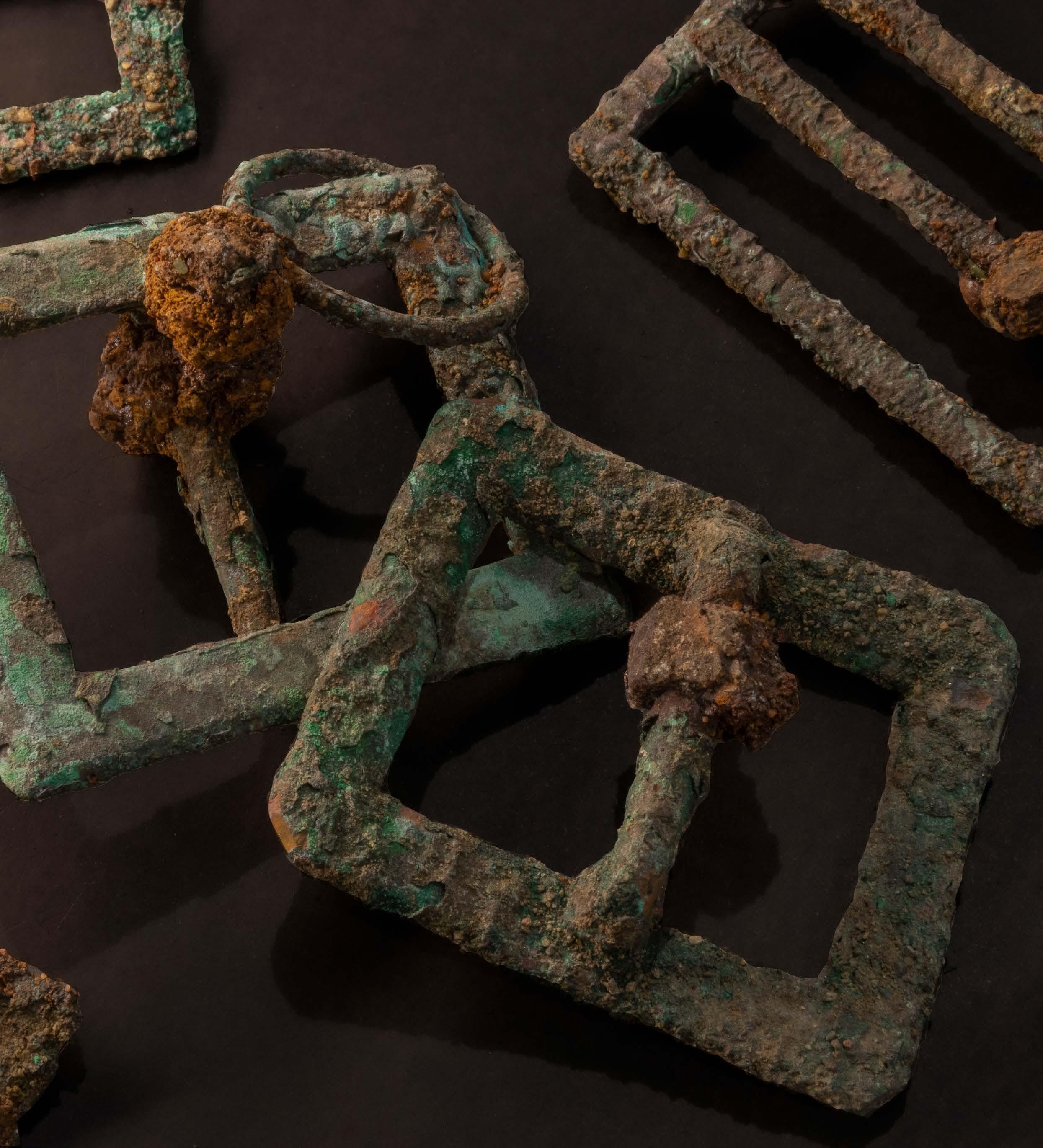 Por otro lado, como parte del contexto arqueológico recuperado en Monserrate, se ha podido rescatar gran número y variedad de hebillas, espuelas y cuchillos. En el caso de las hebillas, estas fueron hechas a base de aleación entre cobre, estaño y hierro, lo que le daría una mayor resistencia para su fin.