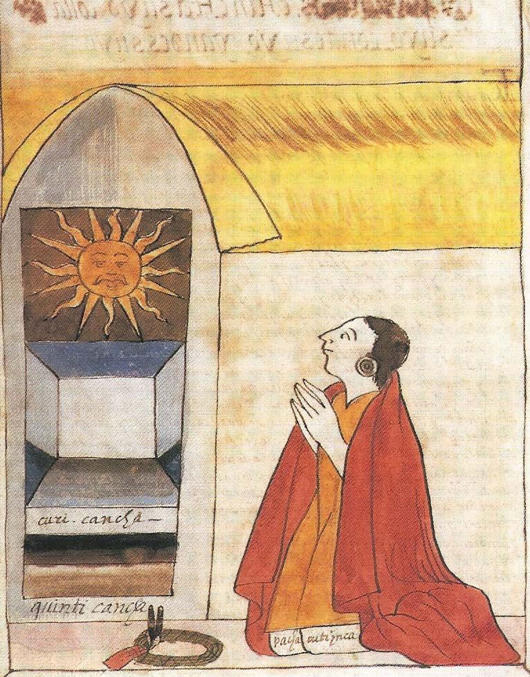 En este estandarte, en la parte inferior izquierda se puede ver el detalle del sol con los rayos ondulantes y angulares intercalados, tal como se muestra en la imagen (Fig. 22). Por otro lado, este diseño del sol ya había sido usado algunos años antes. Por ejemplo, el escudo de las Provincias Unidas del Río de la Plata, que había sido diseñada en 1812 por el peruano Antonio Isidro de Castro (Majluf, 2006), había incorporado el diseño del sol con rayos flameantes y rectos 4. Es probable que estos diseños hayan tenido influencia por los dibujos elaborados por el cronista Martín de Murua, fraile mercedario español autor de valiosas ilustraciones de la historia Inca (Fig. 23).