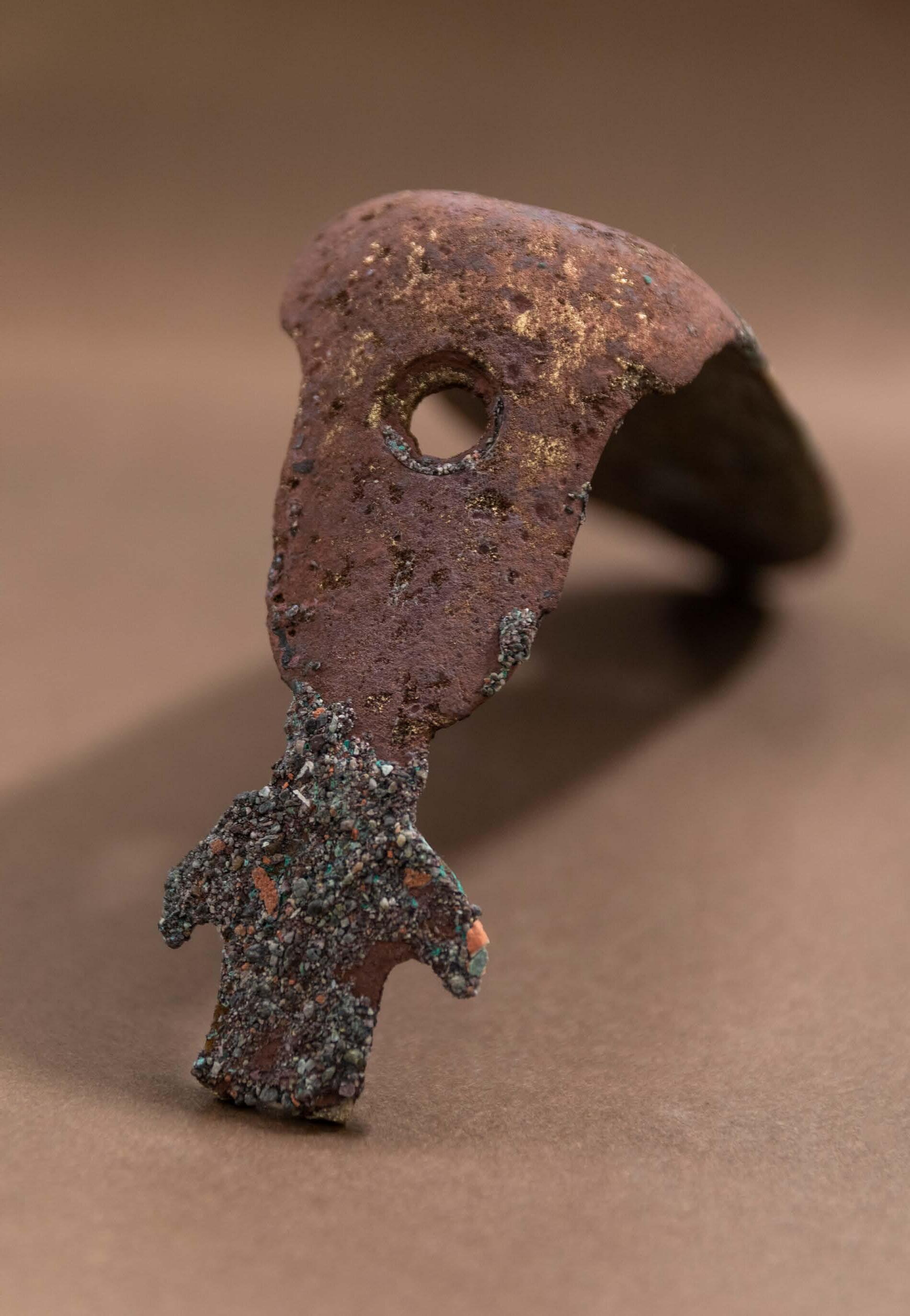Durante nuestras intervenciones, hemos podido recuperar la cantonera de metal de la culata de un fusil. Esta pieza, cuyo largo es de 13.3 cm. y alto es de 8.7 cm. (Fig. 17), fue hecha en una aleación de bronce y pertenecería a un mosque-