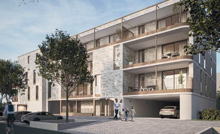 Nieuwbouwproject van 8 appartementen, elk voorzien van een zonnig terras, 2 ondergrondse autostaanplaatsen en gemeenschappelijk een mooie weidetuin met zicht op Belle Vue bos nabij het centrum van Kortessem.