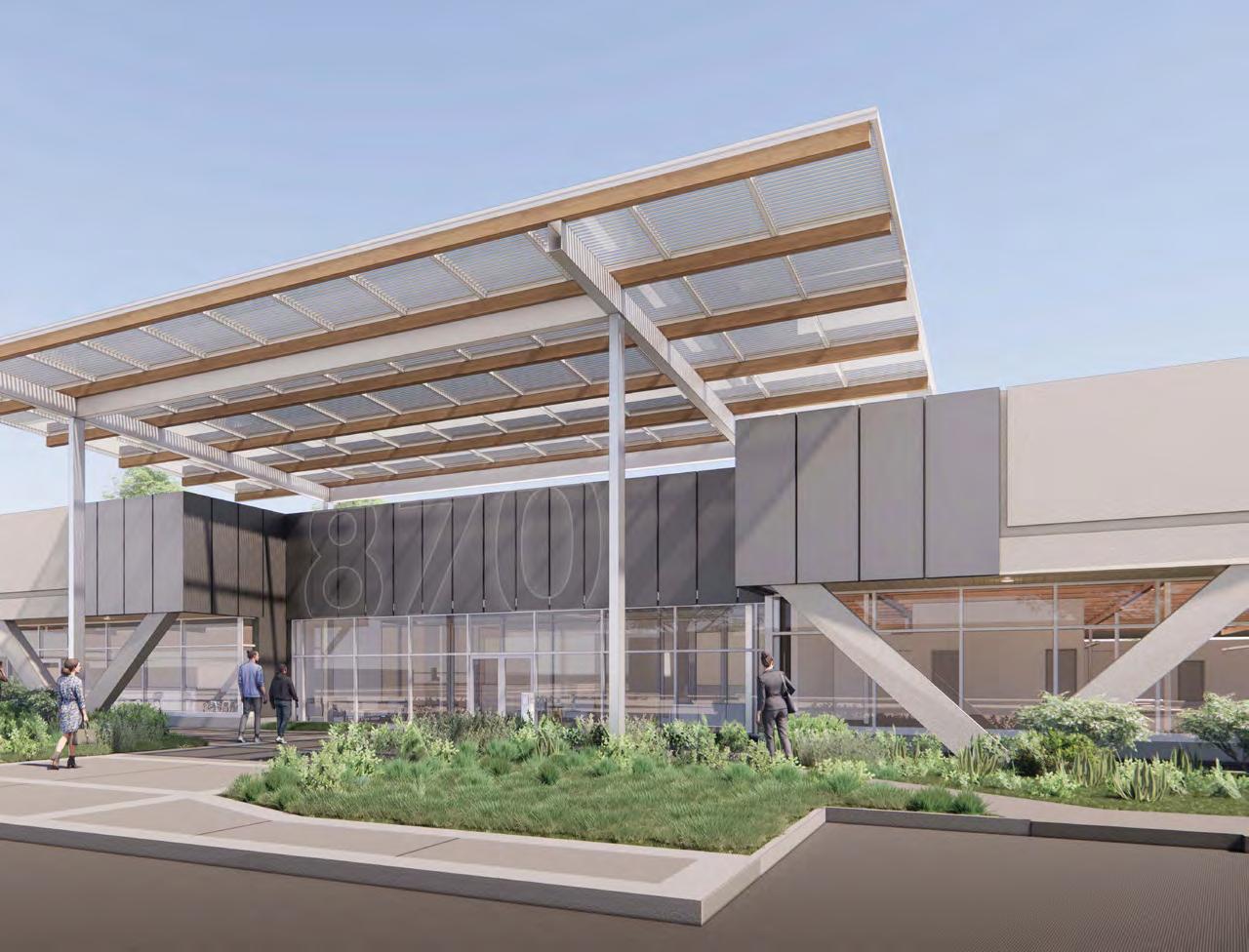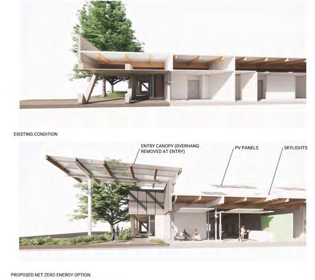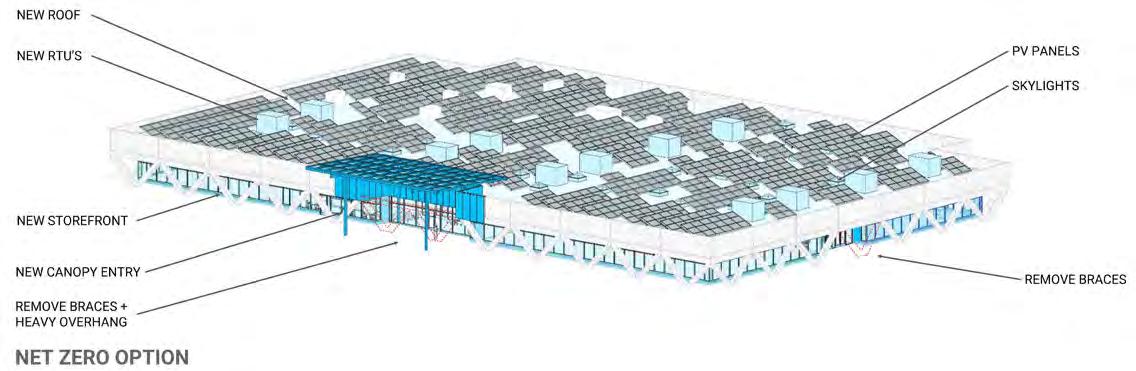 In this repositioning with Irvine Co, we proposed lightening and brightening the entry, from a heavy dark overhang, to a tall canopy of glass and mass timber, with a roof punctuated with skylights, roof insulation added, opaque walls replaced with full height high performance glazing, and slathered in solar panels. Not only would it be Net-Zero energy, it would feel light, airy, cool and tie into the existing material pallette.