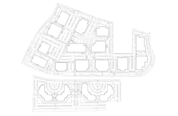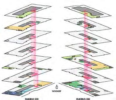 Gradients, inspired by the reflections and refractions of rain and light drove the design of building 333. While building 300 is characterized by bold colors and big programmatic elements.