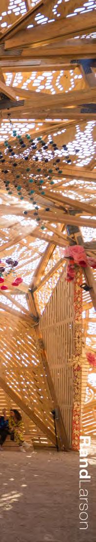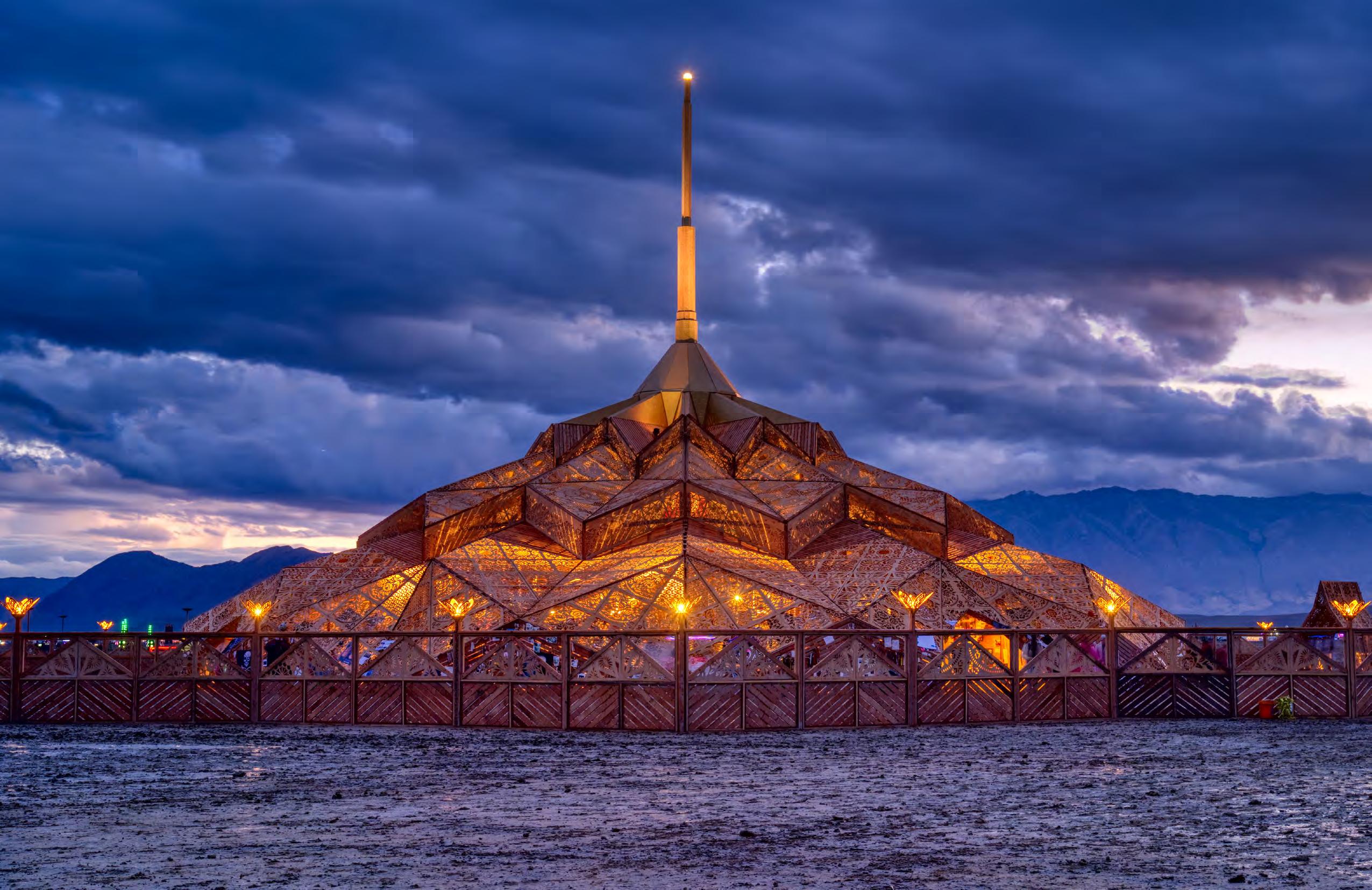Through the building of an incrediblly talented team, we created this spiritual sanctuary amid the chaos of burning man, a place to feel love, grief, celebration, community. Inspired by a desert rose, the roof embraces the temple heart chamber with dappled light through the lacy CNC plywood paneling. Engineered to withstand 70mph winds, the 80ft diameter, 40ft tall structure stood steady through the desert winds.