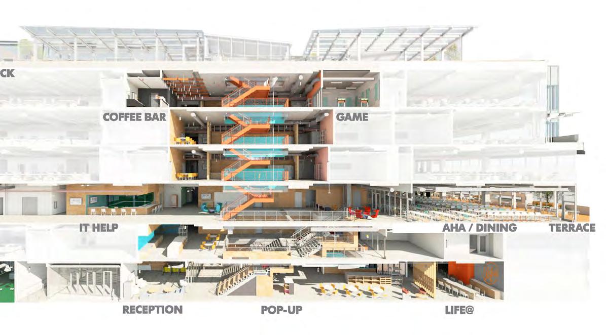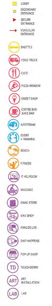 A vibrant verdant campus grows out of isolated defunct buildings. DMB is designed for 8,000 employees, distributed across 17 buildings. Strategically distributed amenities provide convenient access, while concentrating at the central hub, to generate collegiality and inspiration with cafes, events, shops, sports, and arts. Hacker culture is celebrated with open-ended, interactive ways to engage.