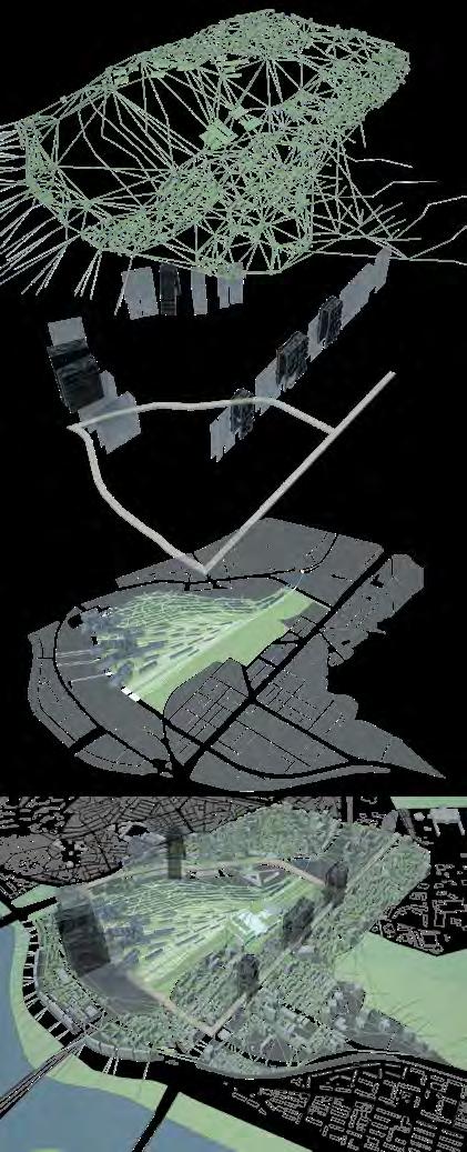 The richness and memory of the old city is not lost in this 2 sq km urban design proposal. Instead of the typical practice of razing the exisitng in favor of a clean slate, we build density into the existing fabric by taking those smaller, discrete volumes and programs and folding them upwards to form towers. These towers are therefore not a solid volume, but let light through, allowing green spaces and roof gardens to thrive and weave over the smaller volumes.