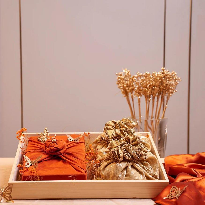 You have the sweet box wrapped in a rust-tinted satin fabric. The embellishments include handmade butterflies and golden brocade pouches. Featuring golden florals too, this gift hamper for women adds a luxurious touch to the art of gifting. The contents of this bountiful gift hamper include: