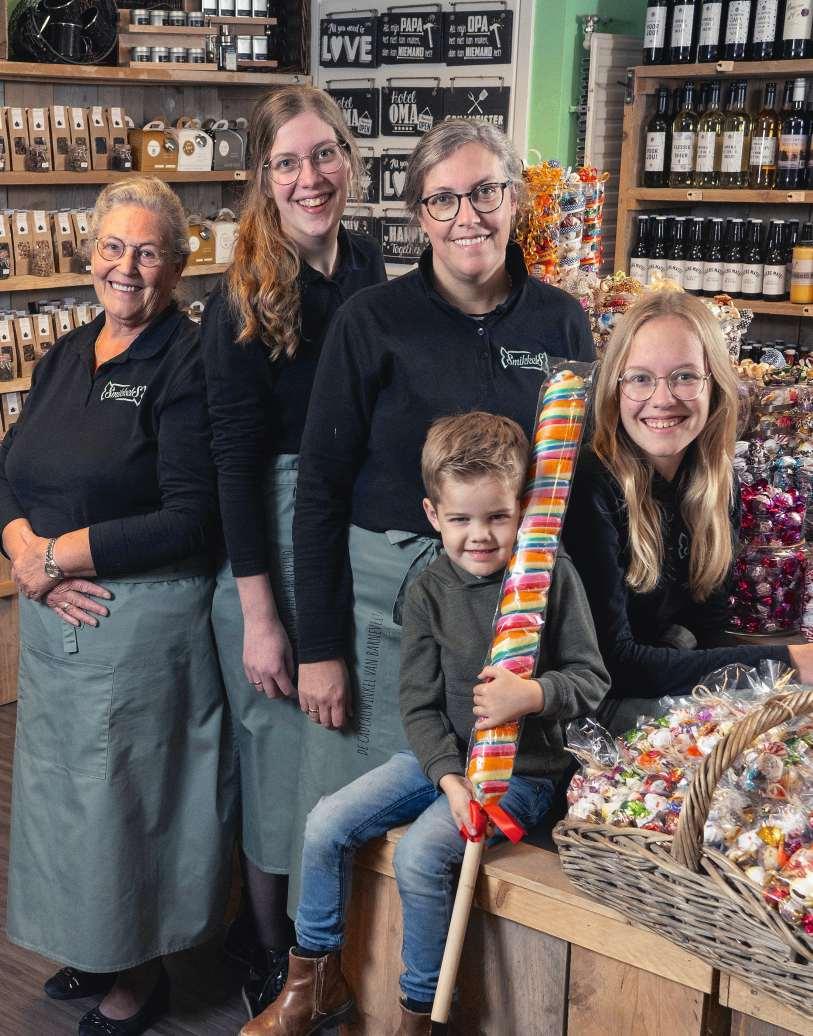 Daarop ging ik met mijn ouders om de tafel en zo is het gekomen Nu werken er allerlei familieleden mee, onder wie mijn oma een dag in de week Mijn zusje Gerrieke helpt op zaterdagen en in de vakanties en m’n broertje Jesse helpt vooral met alles proeven, haha Verder doet mijn vader de boekhouding, en als er heel grote bestellingen zijn, werkt heel huize Randewijk mee Zoals vorig jaar, toen verschillende bedrijven kerstpakketten bij ons bestelden Op onze bruiloft hadden mijn man Geert en ik een mooie ”sweet table” ingericht, zodat de gasten met een lekkere zak snoep naar huis konden Dan pakt iedereen aan om het voor elkaar te krijgen, want dat is ons familiemotto: Als we het met elkaar doen, is het zo klaar