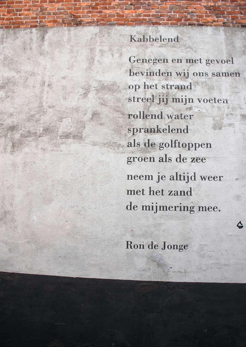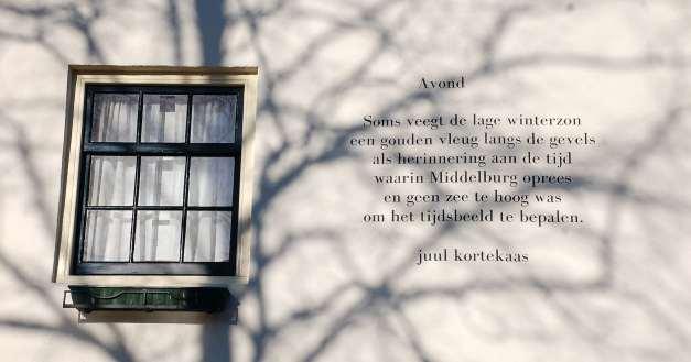 InMiddelburgontdektreporterSarahvanderMaaseen andersoortvurigheid:gedichtenopgrachtengevels, sonnettenopstucwerk,rijmpjesopruiten.Brandgevaar leverendeverzengelukkignietopenalzoudatwelzozijn, danisde„zwemmende,zwevende,zuigendezee”nooitver wegombrandhaardenmeeteblussen.