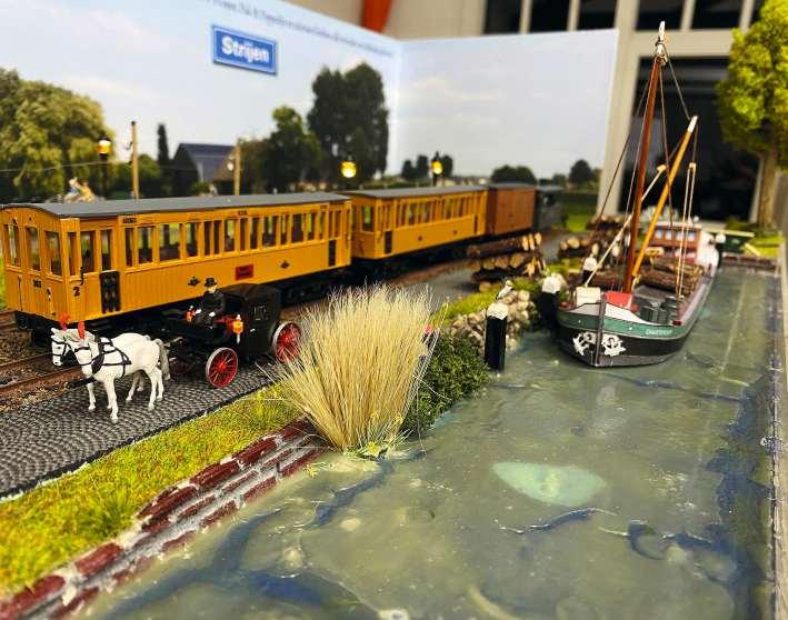 Indeetalageligteenbaanvoorlangeretijd.Eendoor éénvandevrienden3D-geprintetramrijdtgeduldig vanlinksnaarrechts.Adisdearchitect.Endaarkomt hetcreatieveelementomdehoekkijken.„Opzicheen simpelspoorbaantje”,legthijuit,„maarerziteenverhaalachter.Aanhetbeginziejeeenstationwaarhout opwagonsgeladenwordt,datisbijhetdorpHeinenoord.EldersindeHoekscheWaardwordthetgezaagd, jezietpoppetjeszagen,metechtezaaggeluiden,envia eenroutelangsbekendepuntenvanStrijen,zoalsde St.Lambertuskerk,komthettreintjebijdehavenuit.” Daarzittenveleurenwerkin,veeliszelfgemaakt,zoals telefoonpalenmetmetersdraadenzelfseenbruidspaartjebijdekerkontbreektniet. Hetvormteenmooie blikvangervoordemodelvrienden.„Kinderenzitten